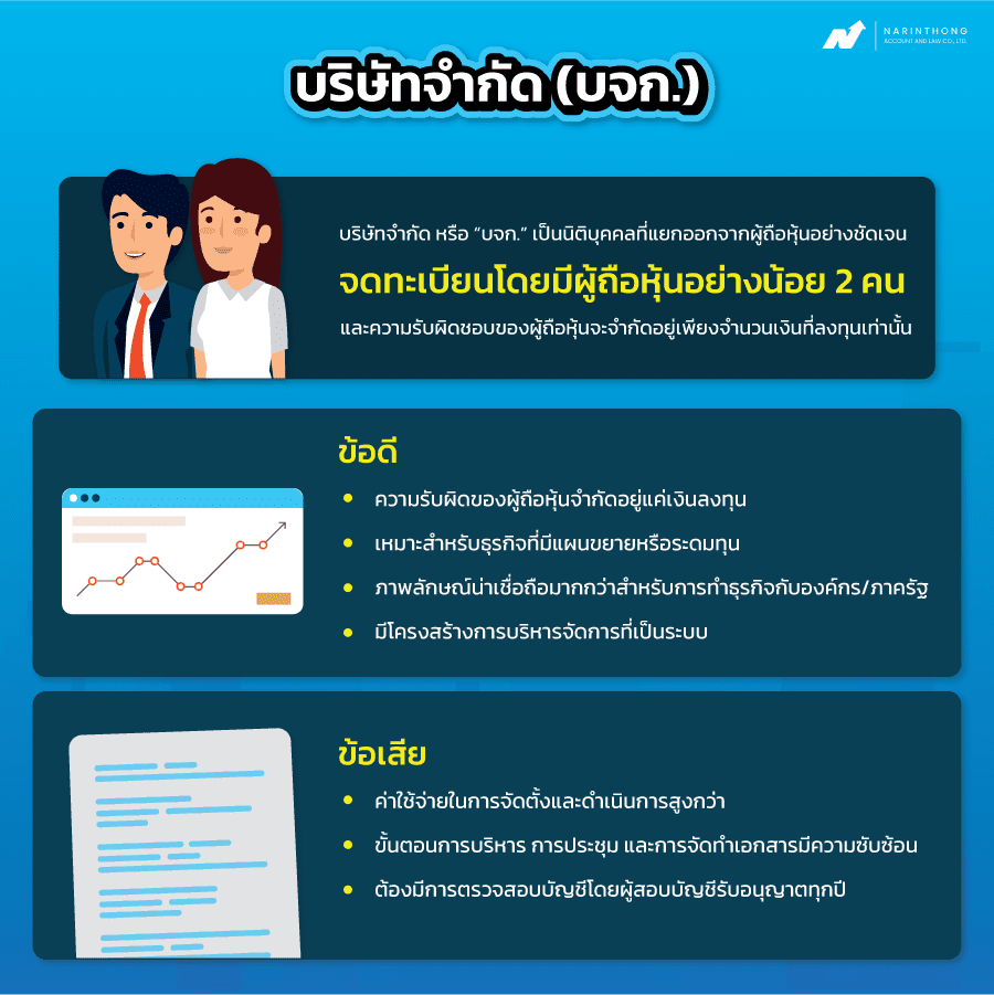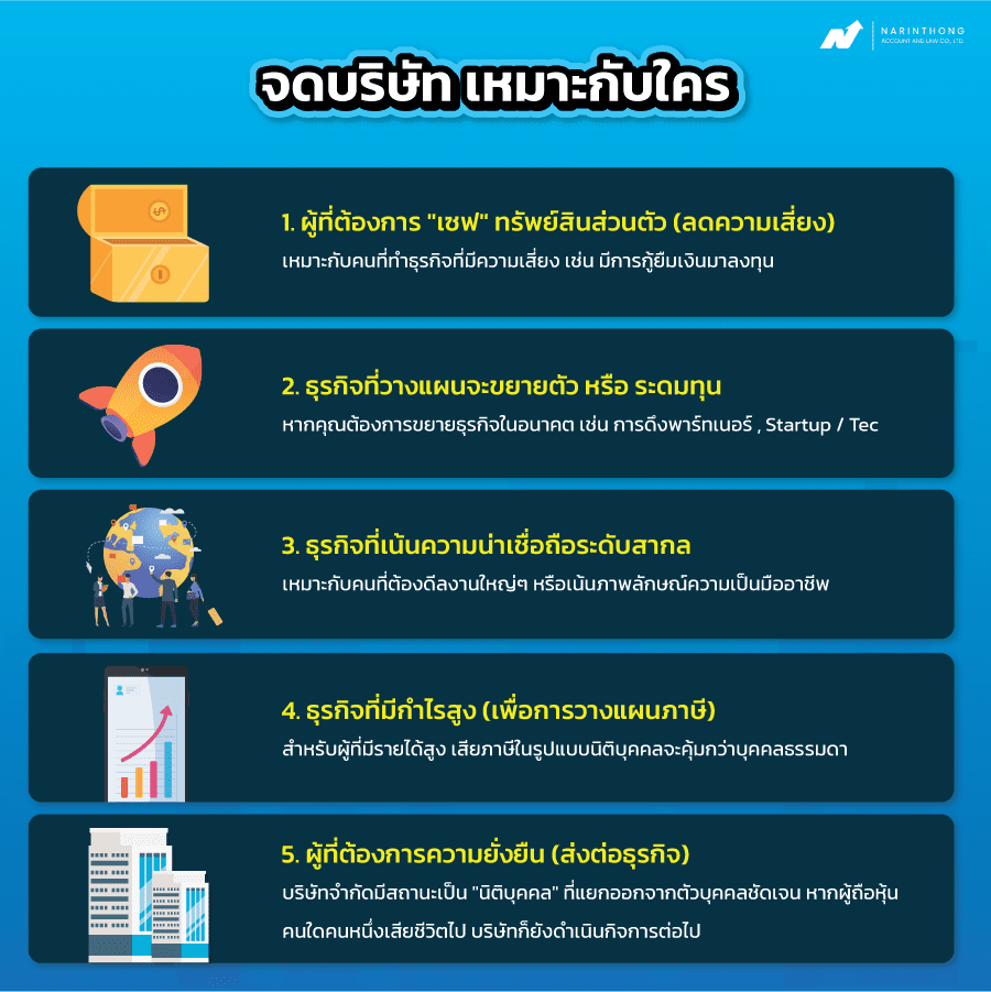 การจดทะเบียนเป็น บริษัทจำกัด (บจก.) โครงสร้างนี้ถูกออกแบบมาเพื่อ การเติบโตและการลดความเสี่ยง โดยเฉพาะ ซึ่งจะเหมาะกับกลุ่มคนดังนี้