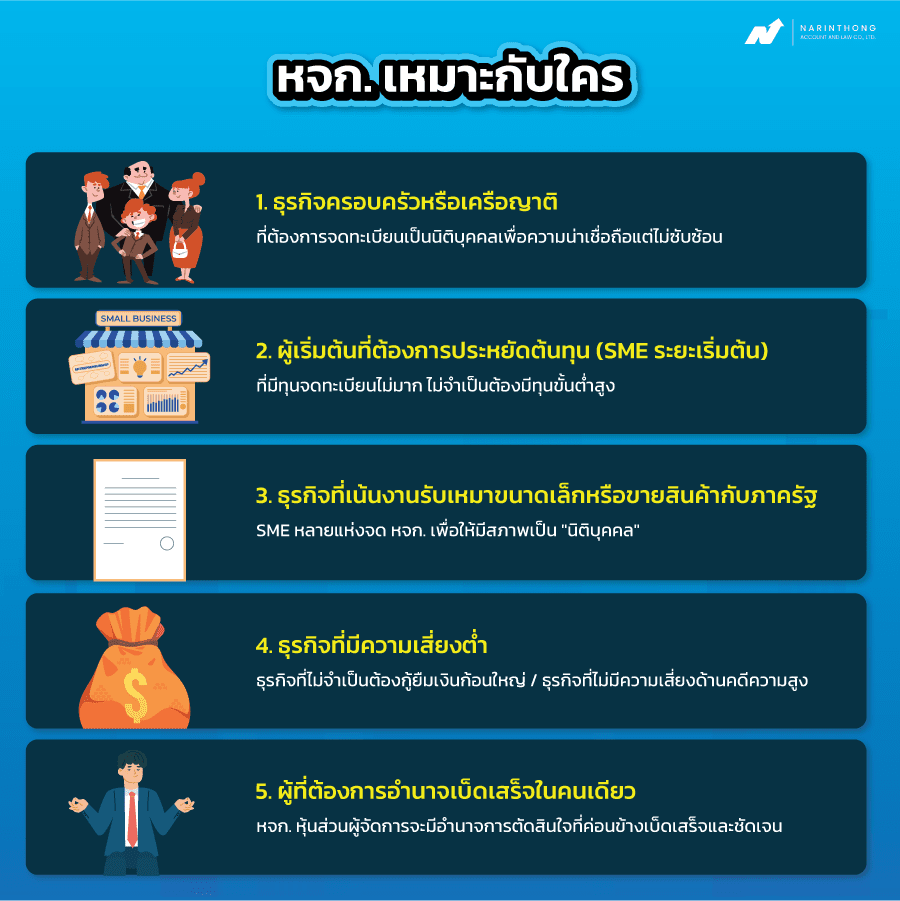 [/color]1. [/size][/color][/size][/color]ธุรกิจครอบครัวหรือเครือญาติ[/size][/color][/size][/color][/size][/color]2. [/size][/color][/size][/color]ผู้เริ่มต้นที่ต้องการประหยัดต้นทุน (SME ระยะเริ่มต้น)[/size][/color][/size][/color][/size][/color]3. [/size][/color][/size][/color]ธุรกิจที่เน้นงานรับเหมาขนาดเล็กหรือขายสินค้ากับภาครัฐ[/size][/color][/size][/color]4. [/size][/color][/size][/color]ธุรกิจที่มีความเสี่ยงต่ำ[/size][/color][/size][/color][/size][/color]5. [/size][/color][/size][/color]ผู้ที่ต้องการอำนาจเบ็ดเสร็จในคนเดียว[/size][/color] [/size]